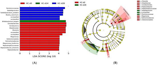 (A) Histogram of LDA scores for differentially abundant bacterial clades in the fecal samples between day 0 (d0), day 14 (d14), and day 28 (d28) in healthy cats (HC). Blue LDA scores represent bacterial groups over-abundant in the HC samples on day 28 after the beginning of antibiotic administration. Green bars represent bacterial groups overrepresented at day 14 after the beginning of the antibiotic therapy. Red bars represent bacterial groups over-abundant in HC fecal samples at day 0. LDA score also indicates the effective size and ranking of each differentially abundant taxon (LDA score > 4.0; p-value < 0.01). (B) Cladogram of phylogenetic relationships of bacterial lineages associated with healthy cats (HC) at day 0 (d0) and day 28 (d28). Note that HC-d14 samples have been analyzed in B as well, but they cannot appear since the outmost level shown by the cladogram is genus, whereas HC-d14 is characterized by a significantly higher abundance of Bifidobacterium longum, which is a species.
