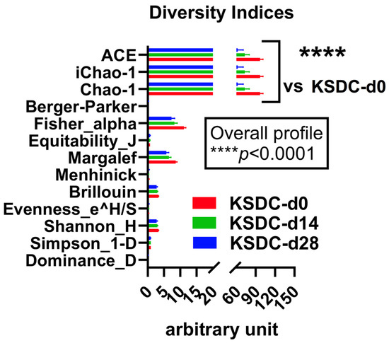 Comparison of the diversity indices among the kidney stone diseased cats (KSDC) at day 0 (d0) (in red), day 14 (d14) (in green), and day 28 (d28) (in blue). **** p < 0.0001, 2-ANOVA followed by a two-stage linear step-up procedure of Benjamini, Krieger, and Yekutieli to correct for multiple comparisons by controlling the False Discovery Rate (<0.05).