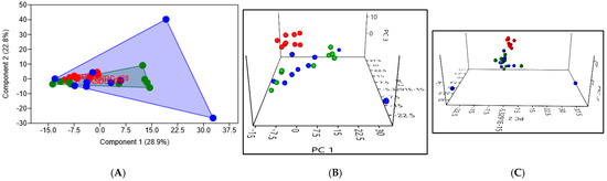 (A) 2D PCA graphic comparing the intestinal microbiota of the healthy cats at D0 (before the initiation of antibiotic therapy) in red, at D14 (after 14 days of antibiotic therapy) in green, and at D28 (14 days after the supposed cessation of the antibiotic efficacy based on cefovecin) in blue. (B,C) Exploring the same previously described patterns with 3D PCA plotting.