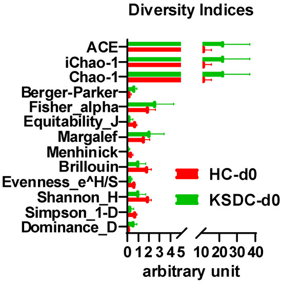 Comparison of the diversity indices between the healthy cats (HC) (in red) and the kidney stone diseased cats (KSDC) (in green) at day 0 (d0). * p-value < 0.05, 2-ANOVA followed by a two-stage linear step-up procedure of Benjamini, Krieger, and Yekutieli to correct for multiple comparisons by controlling the False Discovery Rate (<0.05).