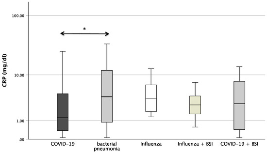 Figure 1 shows the boxplots of the investigated laboratory parameters (CRP, Neopterin, CRP/Neopterin) at admission for the whole cohort of patients with pneumonia divided by the pathogen subgroups. Regarding CRP, a significant difference was found between the pathogens (p = 0.034). In the pairwise post hoc tests, COVID-19 patients presented with significantly lower CRP levels than patients with a bacterial infection (p = 0.003). In addition, significant differences were also found with regard to CRP/Neopterin (p < 0.001). COVID-19 patients had lower CRP/Neopterin ratios compared to bacterial pathogens (p < 0.001) and compared to Influenza patients with superinfection (p = 0.035). Furthermore, patients with bacterial pneumonia showed higher CRP/Neopterin ratios than patients with COVID-19 superinfection (p < 0.001) and than patients with Influenza (p = 0.034) and Influenza superinfection (p = 0.038), as shown in Figure 1.