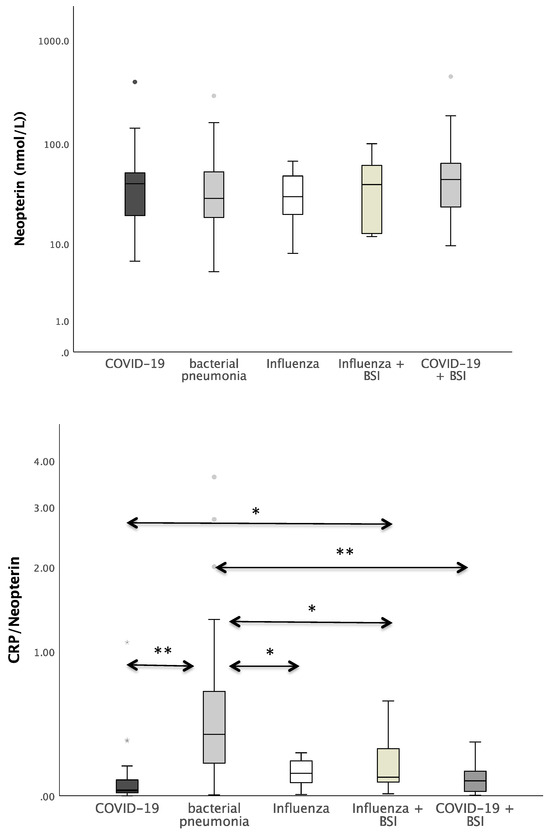 - Rainer, T.H.; Chan, C.P.Y.; Leung, M.F.; Leung, W.; Ip, M.; Lee, N.; Cautherley, G.W.; Graham, C.A.; Fuchs, D.; Renneberg, R. Diagnostic utility of CRP to neopterin ratio in patients with acute respiratory tract infections. J. Infect. 2009, 58, 123–130. [Google Scholar] [CrossRef] [PubMed]