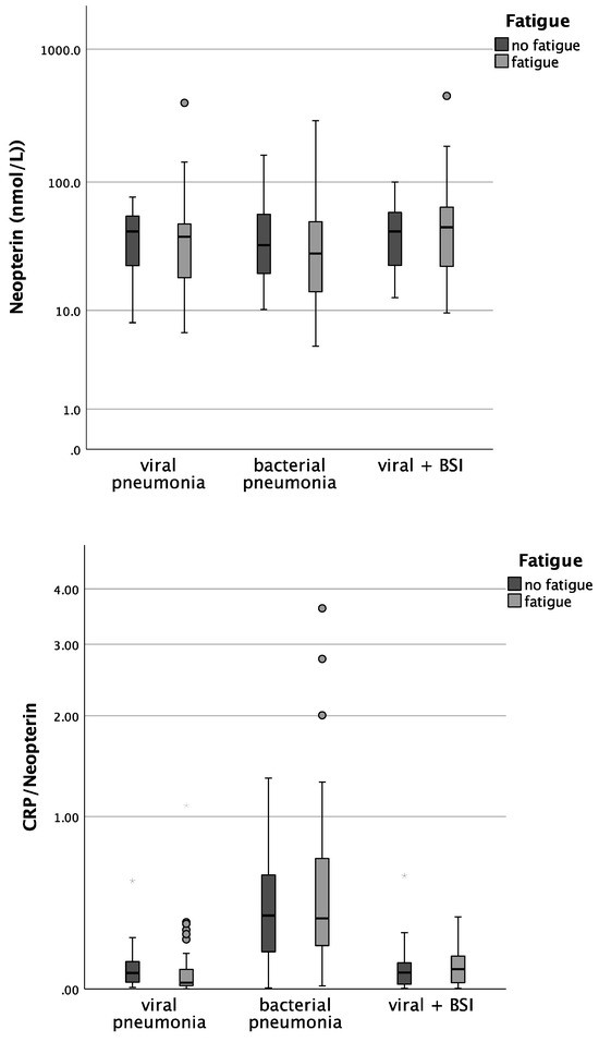 Patients with bacterial pneumonia and fatigue had significantly lower CRP concentrations than patients without fatigue (Table 6, median 1.8 vs. 8.5; p = 0.029). In patients with COVID-19, pneumonia CRP/Neopterin was tendentially lower in patients with fatigue (p = 0.071).