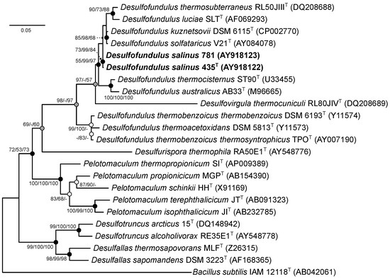 The maximum likelihood phylogenetic tree based on the 16S rRNA gene sequences (1369 nucleotide sites) reconstructed with the GTR + F + I + G4 evolutionary model, showing the position of strains 435T and 781 within the genus Desulfofunfulus. Gray circles indicate that the corresponding nodes were recovered in the reconstructed tree based on the maximum parsimony algorithm; white circles indicate that the corresponding nodes were recovered using the neighbor-joining algorithm; black circles indicate that the corresponding nodes were also recovered based on the neighbor-joining and maximum parsimony algorithms. The bootstrap values (>50%) are listed as percentages at the branching points. Bar: 0.05 substitutions per nucleotide position. The tree was rooted using Bacillus subtilis IAM 12118T as the outgroup. The GenBank accession numbers for 16S rRNA genes are indicated in brackets. The names of the strains described in this study are marked in boldface.