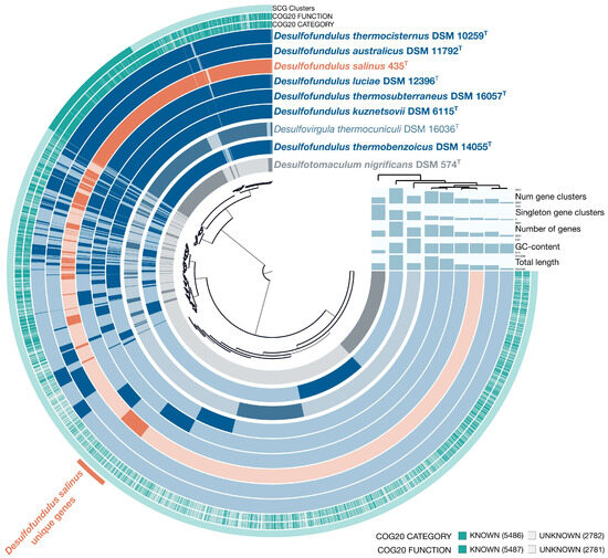 A comprehensive pangenomic analysis was performed on genomes from seven Desulfofundulus strains and Desulfovirgula thermocuniculi, with the genome of Desulfotomaculum (Dt.) nigrificans as the outgroup. This dataset comprised 28,350 genes organized into 8268 gene clusters (GCs). Within this pangenomic landscape, 951 core clusters were consistently present across all genomes analyzed, of which 766 were single-copy genes (SCGs), as shown in Figure 3. The phylogenetic tree reconstructed from these SCGs, spanning 233,613 amino acid sites, mirrored the topology of the phylogenomic tree derived from concatenated analysis of 120 single-copy proteins. This tree confirmed the placement of strain 435T within the genus Desulfofundulus and also indicated that D. thermobenzoicus subsp. thermosyntrophicus did not cluster with the type strains of Desulfofundulus spp., suggesting a distinct phylogenetic history.