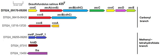 The genes encoding the methenyltetrahydrofolate branch in the genome of strain 435T are located separately. They include metF1-2 (D7024_9255-09260), encoding the enzyme methylenetetrahydrofolate reductase (EC: 1.5.1.54), foldD (D7024_07310), encoding a bifunctional enzyme methenyl-tetrahydrofolate cyclohydrolase (EC: 3.5.4.9)/methylenetetrahydrofolate dehydrogenase (NADP+) (EC: 1.5.1.5), and fhs (D7024_13450), encoding formate-tetrahydrofolate ligase (EC: 6.3.4.3). Interestingly, a duplicate of the main carbonyl branch ascA(cooS)B (D7024_6415-06420) genes is additionally annotated in the genome of strain 435T. The cooS gene is annotated in a cluster with the cooA (D7024_13715-13720) gene, which determines the carbon monoxide-responsive transcriptional activator. The localization of all genes encoding enzymes of the reductive acetyl-CoA pathway in the genome of strain 435T is shown in (Figure 4).