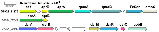 According to the KEGG map of sulfur metabolism, strain 435T reduces sulfate only via the dissimilatory process (Figure S4). The genes of dissimilatory sulfate reduction to sulfite are represented in the genome of strain 435T by two clusters, one of which comprises the sat gene (D7024_11275) encoding sulfate adenylyltransferase (EC: 2.7.7.4), the genes aprAB (D7024_07245-07250) encoding two subunits of adenylylsulfate reductase (EC: 1.8.99.2), and the qmoABC genes encoding the proteins of adenylsulfate reductase-associated electron transfer complex (Figure 5). Another set of the aprAB genes (11260-11265) is represented by a separate cluster. Further sulfate reduction to sulfide via the intermediary metabolite [DsrC-protein]-trisulfide is carried out by dissimilatory sulfite reductase (EC: 1.8.1.22), two subunits of which are determined by the dsrABD cluster (D7024_00345-00355) and by [DsrC]-trisulfide reductase (EC: 1.8.5.10). The latter is coded by a truncated cluster of genes of the dsrMK (D7024_00375-00380) and by the associated dsrC dissimilatory complex (D7024_00375-00385) encoding sulfur redox associated protein. This localization of the genes of dissimilatory sulfate reduction is identical to the orthological one in the genomes of other Desulfofundulus strains, including D. kuznetsovii 17T.