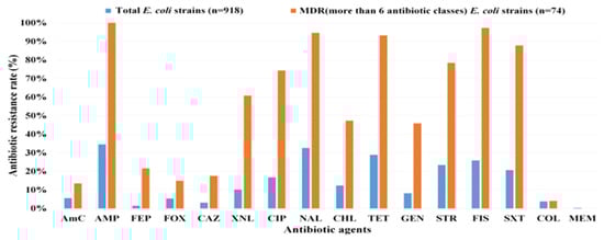 Antibiotic resistance rates. Blue bar: proportion of resistant strains among 918 E. coli strains from wastewater effluents. Orange bar: proportion of resistant strains among 74 strains resistant to six or more antibiotic classes from the same 918 E. coli isolates. AmC, Amoxicillin/clavulanic acid; AMP, Ampicillin; FEP, Cefepime; Fox, Cefoxitin; CAZ, Ceftazidime; XNL, Ceftiofur; CIP, Ciprofloxacin; NAL, Nalidixic acid; CHL, Chloramphenicol; TET, Tetracycline; GEN, Gentamicin; STR, Streptomycin; FIS, Sulfisoxazole; SXT, Trimethoprim/Sulfamethoxazole; COL, Colistin; MEM, Meropenem.