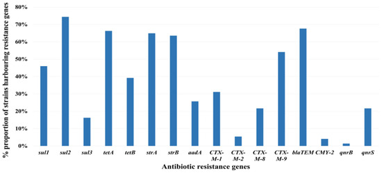 Among the antibiotic resistance genes examined, the following genes had the most prominent prevalence rates: sul2 (74.3%, 55/74), blaTEM (67.6%, 50/74), tetA (66.2%, 49/74), strA (64.9%, 48/74), and strB (63.5%, 47/74). The prevalence of the remaining antibiotic resistance genes is shown in Figure 2. We observed distinct prevalence patterns across various antibiotic classes using antibiotic resistance gene profiling. In the sulfonamide group, sul2 exhibited the highest prevalence, followed by sul1 and sul3. In the tetracycline class, tetA exhibited greater prevalence than tetB. For streptomycin-related resistance genes, strA and strB were detected in over 60% of the cases. In the beta-lactamase group, specifically within the CTX-M family, the CTX-M-9 group was dominant, accounting for 54.1% (40/74) of the prevalence, followed by the CTX-M-1 (31.1%, 23/74), CTX-M-8 (21.6%, 16/74), and CTX-M-2 (5.4%, 4/74) groups. Notably, the presence of CTX-M-25 was not confirmed. Moreover, blaTEM exhibited the highest prevalence rate (67.6%), whereas blaCMY-2 was detected at a frequency of 4.1%. However, blaOXA-1, blaOXA-2, and blaSHV were not detected. We also examined the antibiotic resistance genes associated with quinolones, namely qnrA, qnrB, qnrC, qnrD, qnrS, and qnrVC. Intriguingly, only qnrS (21.6%, 16/74) and qnrB (1.4%, 1/74) were detected, suggesting a relatively limited presence of quinolone resistance genes.
