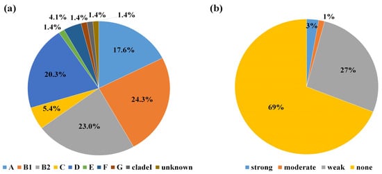 (a) Distribution of phylogenetic groups classified by Clermont et al. [28,29]: Proportion of strains belonging to each phylogroup (A, B1, B2, C, D, E, F, G, clade I, unknown) among the multidrug-resistant 74 E. coli strains; (b) Distribution of biofilm-forming abilities: Proportion of strains classified by biofilm formation (Strong, moderate, weak, none) among the multidrug-resistant 74 E. coli strains.