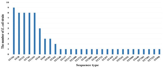 MLST genotypes of 74 multidrug-resistant E. coli strains.