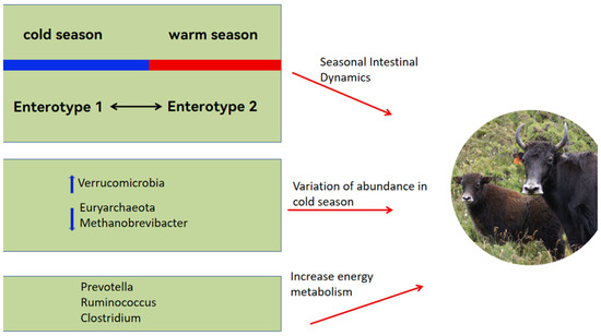 Yaks maintain a stable microbial ecosystem in their rumen to adapt to dietary shifts across different grazing seasons, with microbial populations varying in response to these changes [38]. For instance, there is a greater prevalence of Verrucomicrobia in the cold than the warm season in yak rumen. Verrucomicrobia secretes glycosidic hydrolases that play a key role in the degradation of carbohydrates [39]. The predominant species within this phylum, Akkermansia muciniphila, enlarges the surface area for intestinal absorption, aids in regulating the intestinal barrier, and modulates the microbial community, thereby improving energy utilization [40]. Consequently, the increased presence of Verrucomicrobia during the winter aids yaks in managing energy more effectively under cold conditions. Furthermore, the proportion of certain methanogenic bacteria, such as those from Euryarchaeota and Methanobrevibacter, declines in cold seasons [41], which helps minimize energy losses during severe winter conditions [42].
