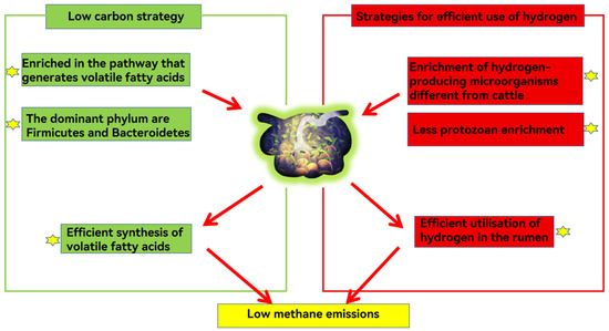The difference in methane emission between yaks and cattle is due mainly to their different enrichment relationships between hydrogen-producing microorganisms, hydrogen-consuming microorganisms and methanogenic hydrogen-nutrient microorganisms [84]. Selenomonas, enriched in the rumen with low methane emission, is involved mainly in the furanate and nitrate reduction metabolic pathways, which are hydrogen-consuming, and, therefore, can effectively compete with methanogenic bacteria for H2 [85]. Methane-producing hydrogenotrophic microorganisms such as Quinella spp. are more abundant in the rumen of yaks than in cattle [79]. The primary fermentation products of Quinella spp. are lactic and propionic acids, which produce little to no hydrogen during fermentation, and a reduction in rumen hydrogen results in less methane emission [86].