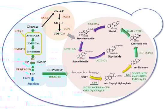Terpenoids are a large class of secondary metabolic natural products in nature. They are used in many applications in various aspects of life because of their various activities. Steviol glycosides (SGs) are glycosidically derived secondary metabolites of kaurene-type tetracyclic diterpenoids, mainly from the leaves of Stevia rebaudiana [1,2]. SGs is a general term for glucoside compounds in S. rebaudiana, and more than 30 types of SGs have already been isolated and identified [3]. The biosynthesis of SGs begins with the isoprene (IPP) of C5, which is converted into dimethylpyrophosphate (DMAPP) via the isomerase IDI1, and then combines three IPPs through a three-step condensation reaction to form geranylgeranylpyrophosphate (GGPP). In S. rebaudiana, IPP is synthesized via the 2-C-methyl-d-erythritol-4-phosphate (MEP) pathway, while in Saccharomyces cerevisiae, IPP is synthesized via the mevalonate (MVP) pathway [4]. GGPP then undergoes two cyclizing reactions to form kaurene via diterpene synthase copyl-pyrophosphate synthase (CPS) and kaurene synthase (KS). Next, under the action of kaurene oxidase (KO) and kaurenoic acid hydroxylase (KAH) from the NADPH-dependent cytochrome P450 oxidase family, there is sequential oxidation at the C19 and C13 positions, leading to the formation of kaurenic acid and the steviol glycoside skeleton (Figure 1) [5,6,7]. Finally, the transfer of different numbers and types of glycosyl molecules via glycosyltransferases at the C13 hydroxyl group and C19 carboxyl group of the steviol skeleton results in the formation of different glycosidic products, which causes the sweetness and taste of various glycosides to vary greatly [8,9]. Studies have shown that the greater the number of glycosylated molecules and the longer the side chains, the more enhanced the taste of SGs [10,11]. The most popular and better-tasting SGs are rebaudioside A, rebaudioside D, and rebaudioside M, which contain four, five, and six glucosides, respectively. Stevioside is slightly bitter and contains three glucosides. In S. rebaudiana, only four glycosylated transferases are involved in the modification of glucosylation, while producing more than 20 glycosides [12]. Glycosylation is thus very complicated and produces many by-products.