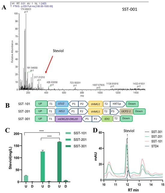 Steviol production in S. cerevisiae. (A) LC-MS diagram of fermentation broth of strain SST-001, the target signal is [M-H]− = 317.212. (B) Schematic diagram of module combination during precursor pathway strengthen. (C) Steviol yield detected in fermentation broth of strains SST-101, SST-201, and SST-301 resulting from precursor pathway enhancement, U is the supernatant and D represents cell precipitation(p value < 0.0001 is labeled as ****). (D) HPLC of fermentation products of strains SST-101, SST-201, and SST-301, STD-4 is the standard of steviol.