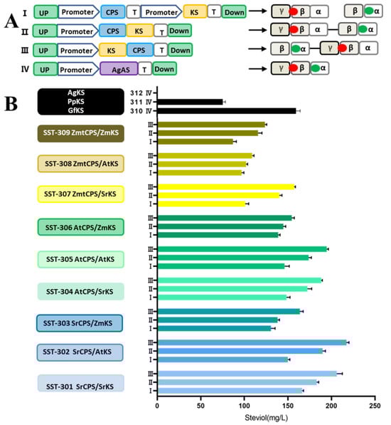 We used the steviol yield as an indicator, selected diterpene synthases from different sources, and tested the effects of different combination patterns on expression to further improve steviol yield. This is because the fusion expression of the two enzymes catalyzing the sequential reaction using flexible linking peptides can improve the binding efficiency of the substrate to the enzyme and minimize the loss of intermediate metabolites [30,31]. In this study, class I/II diterpene synthases, such as SrCPS, SrKS, AtCPS, AtKS, ZmtCPS, and ZmKS, and bifunctional diterpene synthases, such as GfKS, PpKS, and AgKS, were selected. The amino acid sequences of the selected diterpene synthases were compared with SrCPS and SrKS via DNAMAN (Figure S2). The results showed that all the selected diterpene synthases had active catalytic functional regions. The selected genes formed a combination of modules with different patterns (Figure 3A). Combinations II and III involved fusion expression, with the CDS region of the two genes linked via a flexible binding peptide, “GGGS”. There was a sequence exchange between the genes of combinations III and II. Expression module IV represents the bifunctional diterpene synthases, 310 IV, 311 IV, and 312 IV represent GfKS, PpKS, and AgKS, respectively.
