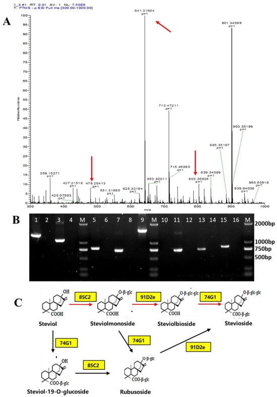 Complete biosynthesis of stevioside in S. cerevisiae. (A) LC-MS full-scan mode of fermentation broth of strain SST-302III-ST, [M-H]− = 479.264, Steviomono-side/Steviol-19-O-glucoside; [M-H]− = 641.316, rubusoside/Steviolbiside; [M-H]− = 803.369, Stevioside. (B) RT-PCR analyses of the introduced heterogeneous genes. Additionally, 1, 3, 5, 7, 9, 11, 13, and 15 of the gel lanes from left to right in the figure, were used engineer strains of SST-302III-ST as the cDNA templates to amplification heterologous genes SrCPS, SrKS, SrKO, SrKAH, SrCPR, SrUGT85C2, SrUGT91D2, and SrUGT74G1; 2, 4, 6, 8, 10, 12, 14, and 16 of the gel lanes were using the cDNA template of the original strain BY4742, and the amplification results were used as negative controls. (C) Schematic diagram of the glycosylation of stevia.