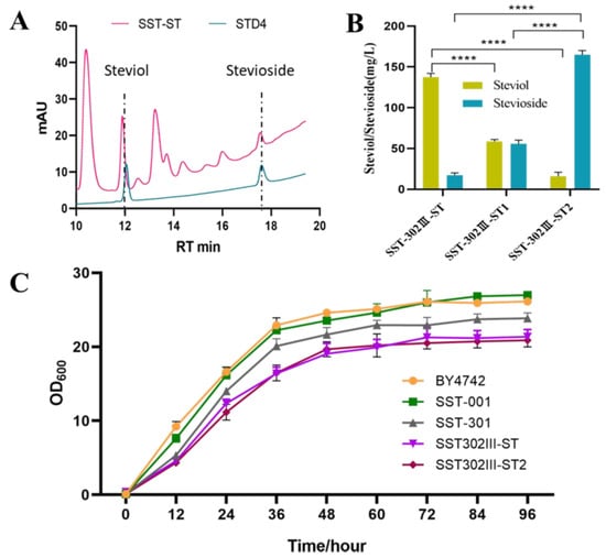 The production of steviside and the biomass of engineering strains. (A) Chromatogram of SST-302III-ST and SST-302III-ST1 products. (B) Production of stevioside and unconverted steviol in strains SST-302III-ST, SST-302III-ST1 and SST-302III-ST2 (p value < 0.0001 is labeled as ****). (C) The growth curve of engineered strains.