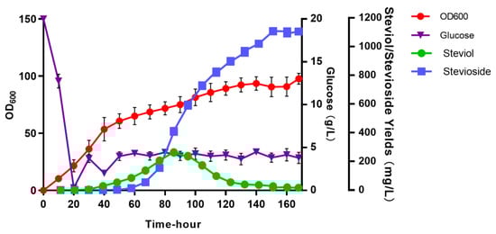 To produce larger amounts of stevioside, the strain SST-302III-ST2 was batch-fed fermented in a 10 L bioreactor, and we plotted the growth curve, the yield accumulation curve of steviol and stevioside, and the consumption curve of glucose (Figure 6). At the beginning of fermentation, 20 g/L of glucose was added as a carbon source to make the strain grow rapidly. The glucose was exhausted at 20 h; then, the flow filling of glucose was started, and the concentration of glucose in the fermentation broth was always lower than 5 g/L. The strain entered a stable period at 60 h, until the end of fermentation, with OD600 up to 91.96. At 20 h, we detected 5.27 mg/L of steviol. This yield gradually increased, the accumulation of steviol reached its maximum at 233.64 mg/L at 90 h, and the amount gradually decreased until the end of fermentation, with 5.98 mg/L remaining. We detected 2.55 mg/L of stevioside at 40 h. The yield of stevioside increased exponentially after 80 h, reaching 1104.49 mg/L by the end of fermentation at 168 h. This is one of the higher yields reported in the study of the heterologous production of stevioside from S. cerevisiae, compared with those obtained for rubusoside and rebaudioside A, which contain two and four glucose groups, respectively. This is because there are no reports on its yield as an intermediate product. Although stevioside is not a popular SG, its high yields also form the base for the production of other steviosides.