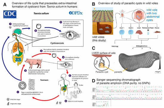 Overview of the rodents (voles) tested in this study and identification of the hepatic parasitic cyst as the larval stage of Hydatigera taeniaeformis tapeworm. (A) Contextualization of the clinical and ecological relevance of human cysticercosis, exemplified with Taenia solium. (CDC public domain image). (B) Samples collected from the voles in this report. (C) Schematic of origin of samples within metacestode (parasitic-cystic structure) for analysis and photomicrograph, illustrating distinctive microscopic segmentation of the parasite as indicative of an immature strobilocercus metacestode. Not detailed: the parasite lacks visualized hooks and the overall size suggests that this cyst-like structure is an immature strobilocercus. (D) Chromatogram after Sanger sequencing used for tapeworm identification as Hydatigera taeniaeformis illustrates pure DNA and homogeneous amplicon in the cyst samples tested in this study.