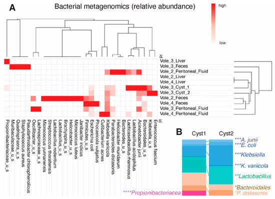 Metagenomic analysis revealed a relatively simple bacterial community inside the two cysts, demonstrating that these symbiotic bacteria could avoid the immune system and flourish over time in a nutrient-depleted lesion. At the species level, Klebsiella variicola comprised 18.34% and 35.48% of the total bacterial population in cysts 1 and 2, respectively, followed by Enterococcus faecium in cyst 2 (32.59%). K. variicola was also highly abundant in the peritoneal fluid samples of vole 2 (33.34%), vole 3 (39.86%) and vole 4 (74.9%) and in the feces samples of vole 2 (29.66%) and vole 4 (37.96%). In contrast, the vole 3 liver was entirely inhabited by Propionibacteriaceae, which only constituted 8.95% of cyst 1 (Figure 2A,B).