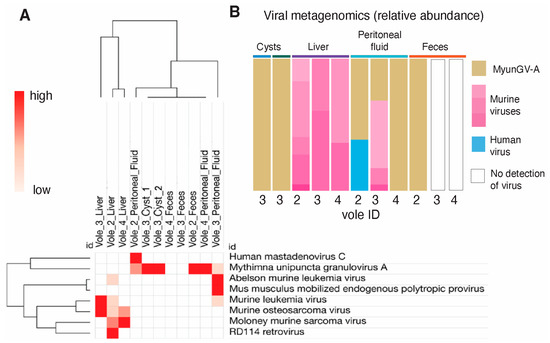 Metagenomic analysis of viruses revealed MyunGV-A in Hydatigera larval cysts and peritoneal fluid of wild voles. (A) Hierarchical clustering of samples based on abundance. Euclidean distances. (B) Abundance bar plot. MyunGV-A in both cysts was 100%, with similar findings in the peritoneal fluid and feces of other voles.