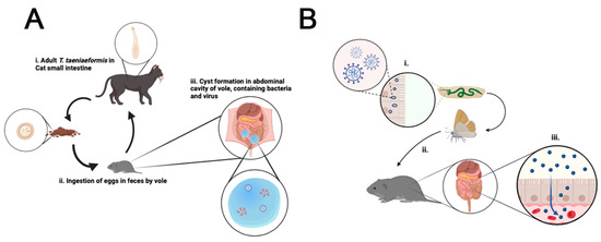 Herein, we report the results from a metagenomics community composition analysis of various tissue samples from locally and temporarily related wild voles (likely from the same colony or family), one of which was affected by two extra-hepatic tapeworm cysts. The identified tapeworm, H. taeniaeformis, is widely abundant globally [30]. Like other tapeworms, this parasite has been documented in a variety of mammals, primarily infecting cats and other feline species [31] (Figure 4A). H. taeniaeformis typically infects felines, with rodents serving as the primary intermediate host for the larval form, strobilocercus [32,33].