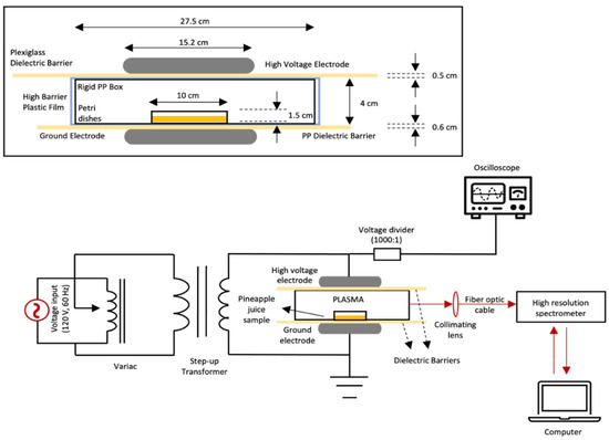 Schematic of the components of the dielectric barrier, high voltage atmospheric cold plasma (HVACP) system used to treat pineapple juice.