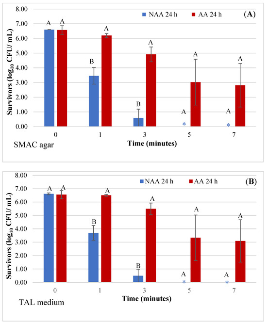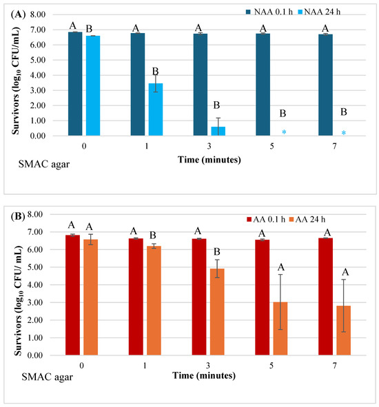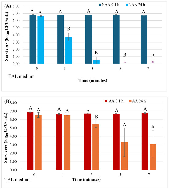 Effect of physiological state (NAA and AA) on the survival of Escherichia coli O157:H7 in raw pineapple juice held at 4 °C for 24 h after HVACP (70 kV) treatment. Survivors were recovered on sorbitol MacConkey (SMAC) agar (A) and TAL medium (B). For each treatment time, different first letters (A or B) above the bars indicate a significant difference in the viable counts of NAA and AA cells (p < 0.05). Asterisk (*) indicates that the pathogen was not detected.