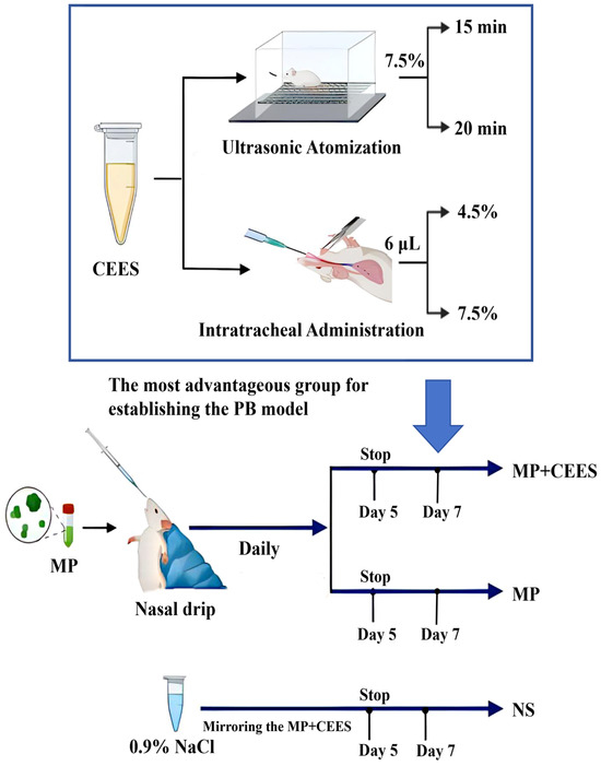 BALB/c mice are the preferred animal model for establishing MP infection [25]. Principally, they exhibit heightened susceptibility to MP infection. Furthermore, their status as an inbred strain ensures genetic uniformity, thereby facilitating reproducible experimental outcomes. Additionally, they boast advantageous reproductive traits alongside a prolonged breeding duration. The prevailing protocol for establishing the MP infection model in these mice entails continuous nasopharyngeal instillation of a 50 µL bacterial suspension over a five-day course [26]. Peak pulmonary inflammatory responses are observed within the first week following inoculation [27]. Consequently, BALB/c mice were employed in this study, with subsequent interventions and observations timed to coincide with the apex of pulmonary inflammatory severity, occurring one week after infection. PB peaks at 18 h after CEES exposure in rat models. Thus, this timeframe is optimal for evaluating PB manifestations.