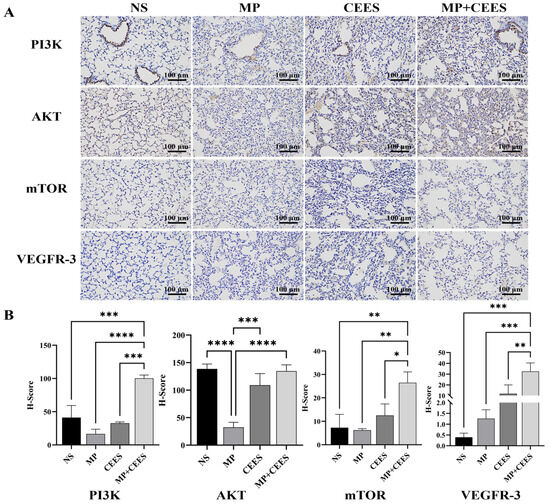 This investigation assessed the impact of combined MP+CEES on the PI3K/AKT/mTOR signaling cascade and VEGFR-3 protein expression in murine pulmonary tissue via immunohistochemistry. Specimens stained with DAB and imaged at 200× magnification revealed that, relative to controls, the MP+CEES cohort exhibited a substantial amplification of cytoplasmic PI3K, AKT, and mTOR immunoreactivity, manifesting as intensified dark brown granular staining, suggestive of heightened protein activation states. Image analysis software quantitation disclosed that the PI3K/AKT/mTOR positive area ratio in the experimental group surpassed that of the control by approximately a tripling magnitude, whereas VEGFR-3’s positive area fraction escalated by an eighty-fold increment (Figure 4). These findings suggest that the combination of MP+CEES significantly enhances the activation of pivotal signaling proteins and escalates the expression of lymphangiogenesis-associated proteins, thereby furnishing tangible evidence that fosters a deeper investigation into their modulatory roles within inflammatory responses and lymphatic vessel development processes.