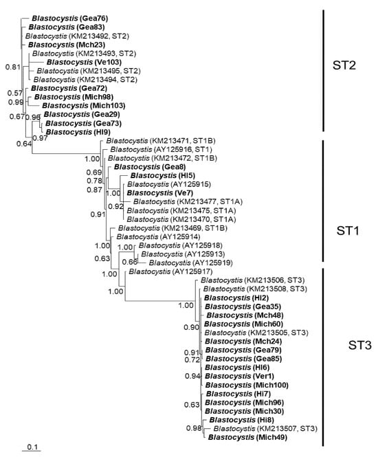 In general, the topology of the phylogenetic trees for the three loci was similar, supported by high posterior probability values (Figure 1, Figure 2 and Figure 3). The most homogeneous clusters were observed for ST1 and 3; particularly, ITS ST1 sequences were grouped only in subgroup A (Figure 1; ST1A) cluster, in accordance with what was previously documented for this marker []. Due to the lack of available sequences for ITS and rlp2 for the different Blastocystis STs, only trees with STs 1–3 are shown here; however, for SSUrDNA, a phylogenetic tree was built with all recognized subtypes, and its topology was concordant with the tree for STs 1–3 (Figure 3).