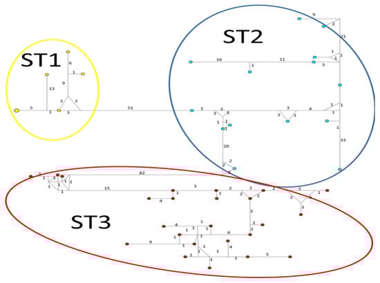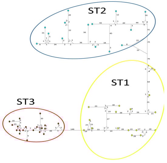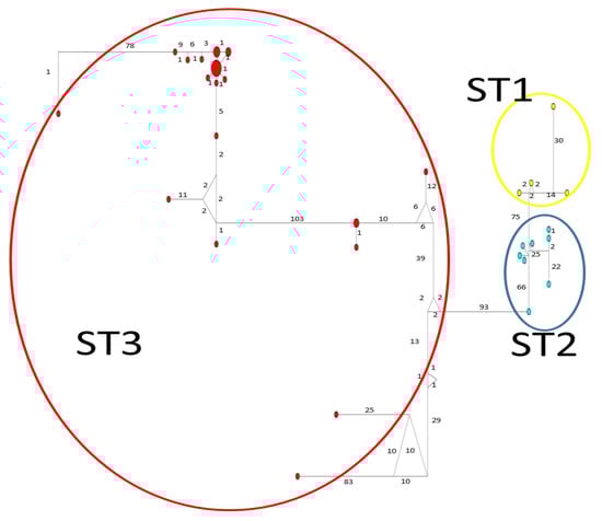 The STRUCTURE software is a common tool widely used for population analysis because it supports researchers to assess patterns of genetic structure in a set of samples, assigning individuals to subpopulations based on analysis of likelihoods []. There are many examples of articles about the usefulness of the STRUCTURE program to establish new variants in parasites such as Toxoplasma gondii [,] and Plasmodium falciparum []. Here, the STRUCTURE bar plots for the three loci used clearly revealed the presence of three subpopulations corresponding to STs 1–3, respectively.