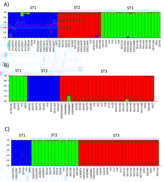 The STRUCTURE software assigned the samples studied here to three subpopulations, and these subpopulations corresponded to STs 1–3, respectively (Figure 7). There were no mixed samples that could not be assigned to any of the three existing subpopulations. Interestingly, the bar plot for ITS showed more diversity of colors in each subpopulation, i.e., few samples with more than one color were observed; in contrast, the rpl2 and SSUrRNA sequences were completely homogeneous. The population indices were generally concordant among the three loci analyzed (Table 3). Comparisons between STs showed that ST3 exhibited the lowest π values with all three loci. The only significant value in Tajima’s D was for ST3 with rpl2 (−2.1949).
