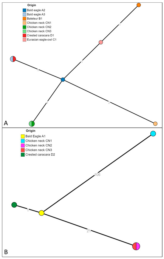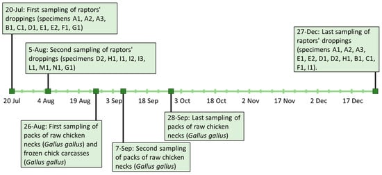 Dropping samples of the first 10 birds of prey (specimens A1, A2, A3, B1, C1, D1, E1, E2, F1, G1) were conferred at the Istituto Zooprofilattico Sperimentale del Lazio e della Toscana “M. Aleandri” (IZSLT), UOT (Territorial Operative Unit) Tuscany North (Pisa). The samples were collected on the 20 July 2021 inside the aviaries that housed these species separately: n = 3 Bald eagle (Haliaeetus leucocephalus) (A1, A2, A3), n = 1 Bateleur (Theratopius ecaudatus) (B1), n = 1 Eurasian eagle-owl (Bubo bubo) (C1), n = 1 Crested caracara (Caracara plancus) (D1), n = 2 African fish eagle (Haliaeetus vocifer) (E1, E2), n = 1 Black-chested buzzard-eagle (Geranoaetus melanoleucus) (F1) and n = 1 Hooded vulture (Necrosyrtes monachus) (G1). A second droppings sampling of the last 8 birds of prey (specimens D2, H1, I1, I2, I3, L1, M1, N1) and a second droppings sample of G1 was carried out two weeks later on the 5 August 2021: n = 1 Crested caracara (C. plancus) (D2), n = 1 Hooded vulture (N. monachus) (G1), n = 1 Egyptian Vulture (Neophron percnopterus) (H1), n = 3 Barn owl (Tyto alba) (I1, I2, I3), n = 1 Tawny owl (Strix aluco) (L1), n = 1 Black kite (Milvus migrans) (M1) and n = 1 Harris’s hawk (Parabuteo unicinctus) (N1). On 27 December 2021, a new sampling of droppings from some of the birds of prey already tested was performed. In particular, n = 12 droppings samples were taken and composed as follows: n = 3 Bald eagle (H. leucocephalus) (A1, A2, A3), n = 2 African fish eagle (H. vocifer) (E1, E2), n = 2 Crested caracara (C. plancus) (D1, D2), n = 1 Egyptian vulture (N. percnopterus) (H1), n = 1 Bateleur (T. ecaudatus) (B1), n = 1 Eurasian eagle-owl (B. Bubo) (C1), n = 1 Black-chested buzzard-eagle (G. melanoleucus) (F1) and n = 1 Barn owl (T. alba) (I1). A summary of sampling activities and results is reported in Section 3 and in Figure 1.