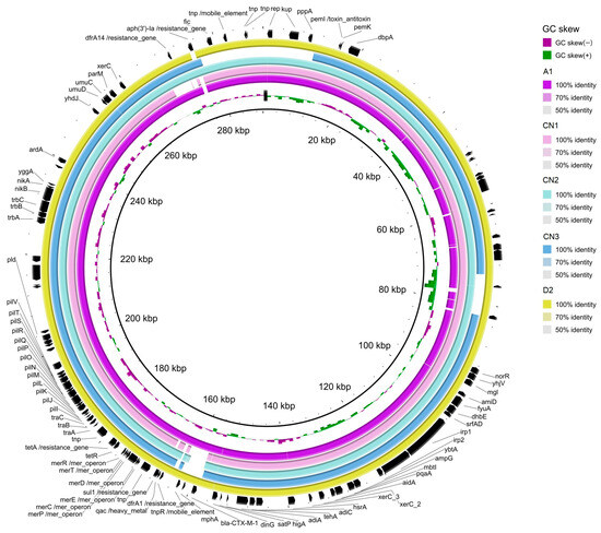 The blast alignment of the assemblies against the reference pESI-CTX-M-1 (NZ_OW849779.1) (Figure 3) evinced that some contigs of the S. infantis genome could be identified as part of the pESI plasmid. Those contigs contained dfrA1, sul1 and tetA in all 5 S. infantis, dfrA14 in all but in CN1, aph(3″) only in CN2 and CN3 and blaCTX-M-1 only in A1 and D2. All assemblies also carried resistance genes towards heavy metals (merA) and disinfectants (qacEΔ). Although, plasmidFinder identified IncFIB, described as the origin of replication for pESI, it was missing in the blast CN3 alignment. Together, those evidences indicated that all the 5 S. infantis isolates harboured pESI.
