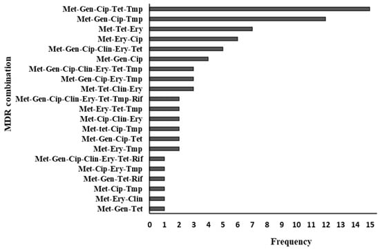 Multidrug resistance patterns of 76 MRSA strains. Met—methicillin, Gen—gentamicin, Cip—ciprofloxacin, Ery—erythromycin, Tet—tetracycline, Clin—clindamycin, Tmp—trimethoprim-sulfamethoxazole, Rif—rifampicin.