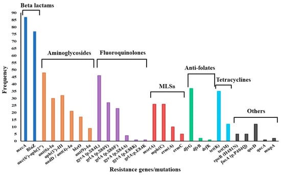 Of the 96 genomes analyzed, 87 were complete, while 9 were dropped because of incompleteness or lower sequencing depths. Whole-genome sequencing coverage (the number of times the whole genome was sequenced) ranged from 30× to 96×, with an average depth of 36×. AMR gene carriage per genome varied between two and thirteen genes. In general, aminoglycoside resistance genes showed the greatest diversity, with the bifunctional acetyltransferase/phosphotransferase aac(6′)-aph(2″) dominating. Further, aac(6′)-aph(2″) was present in all cases of phenotypic resistance to gentamicin. Other aminoglycoside resistance genes occurred in combination, whereby aph(3′)-III was common. Low-affinity dfrG was the most frequently encountered anti-folate resistance determinant (dfrG, n = 37; dfrB, n = 2; dfrK, n = 1), while the tetracycline efflux pump tetK was dominant (tetK, n = 35; tetM, n = 12). Macrolide-lincosamide-streptograminB (MLSB) resistance-conferring methylase genes ermA and ermC were rarely encountered, as shown in Figure 3. MSB resistance genes msrA and mphC were encountered equally frequently. Among mutations conferring fluoroquinolone resistance in the quinolone resistance-determining region (QRDR), the gyrA serine-leucine substitution (S84L)/grlA serine-tyrosine substitution (S80Y) combination of mutations was the most frequent. Consistent with a lack of phenotypic resistance, there were no determinants suggestive of resistance against vancomycin, teicoplanin, linezolid, or tigecycline.
