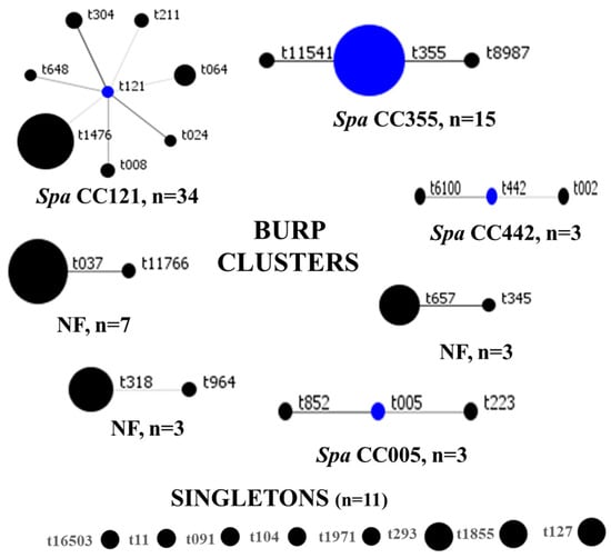 Staphylococcal cassette chromosome mec (SCCmec) typing with SCCmecFinder version 1.2; Multilocus sequence typing (MLST) with MLST version 2.0 [29] and staphylococcal protein A (spa) typing based on SpaTyper version 1.0 [30], all contained within the Centre for Genomic Epidemiology (CGE) platform, were performed, based on the default parameters of the respective programs. To cluster spa types, tandem repeat orders were used to retrieve tandem repeat nucleotide sequences from the SpaServer database (https://spa.ridom.de/ accessed on 12 July 2023), which were then concatenated and clustered using the Based Upon the Repeat Pattern (BURP) algorithm using Ridom StaphType Software version 2.0 (Ridom Bioinformatics). Clustering parameters were set as “exclude spa types with <5 repeats and cluster sequences if cost ≤ 4” parameters [31]. Nomenclature for SCCmec elements was based on the guidelines of the International Working Group on the Classification of Staphylococcal Cassette Chromosome Elements [32]. Clustering of MLST STs was based on the Based Upon Related Sequence Type (BURST) algorithm contained within the PubMLST database.