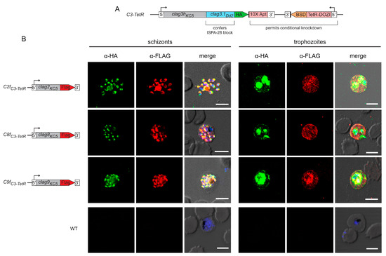 As other CLAG paralogs have not been as well characterized as CLAG3, we began our studies by examining the localization and trafficking of these paralogs through epitope tagging each family member in the C3-TetR parasite line [29]. C3-TetR is an engineered line with several desirable features (Figure 1A). It was produced in the wild-type KC5 line, which carries a single clag3h gene; most laboratory lines carry two clag3 genes that exhibit monoallelic expression through epigenetic switching [14,16,22]. The use of KC5 avoids epigenetic switching. Transfection to produce C3-TetR also replaces the last exon of clag3h with the corresponding region of Dd2 clag3.1; this substitution confers sensitivity to ISPA-28, an inhibitor that is highly selective for channels associated with expression of the Dd2 clag3.1 last exon. The encoded protein also carries a C-terminal HA epitope tag and a 10× aptamer sequence in the 3′ UTR to recruit the TetR-DOZI fusion protein, permitting conditional knockdown through anhydrotetracyline-dependent expression [33].