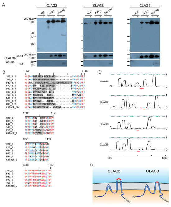 While early studies established that CLAG3 is exported into the host erythrocyte and is concentrated at the host membrane [35], susceptibility to extracellular protease treatment was required to establish that CLAG3 is integral and exposed at the host membrane surface [22,23]. We confirmed this observation in the C3-TetR line (Figure 2A, last lane of the first panel). The cleavage product size, ~40 kDa in C3-TetR, indicates cleavage at a site this distance from the protein’s C-terminus. Importantly, this position corresponds to the primary variable region that exhibits sequence and length polymorphisms between geographically divergent parasite isolates (Figure 2B, gray highlight showing the hypervariable region, HVR). Because this cleavage product partitions exclusively into the membrane fraction after Na2CO3 (Figure 2A, last lane), there are one or more transmembrane domains distal to the HVR. CLAG2 exhibited a similar cleavage product that is also integral to membranes (Figure 2A), implicating a similar protease-mediated cleavage within the smaller CLAG2 HVR (Figure 2B, second alignment graphic). CLAG8 and CLAG9 were not susceptible to extracellular protease, consistent with much less variation between sequences at the presumed surface-exposed site (Figure 2A,B). Computational analysis suggests that each paralog has hydrophobic regions on both sides of this site (Figure 2C, red dash), implicating transmembrane domains on either side of a small surface-exposed region. These observations suggest that each paralog inserts at the host membrane with a similar topology. CLAG3 and CLAG2 appear to have relatively larger loops exposed to plasma, while CLAG8 and CLAG9 have smaller loops that are resistant to extracellular protease treatment (Figure 2D).
