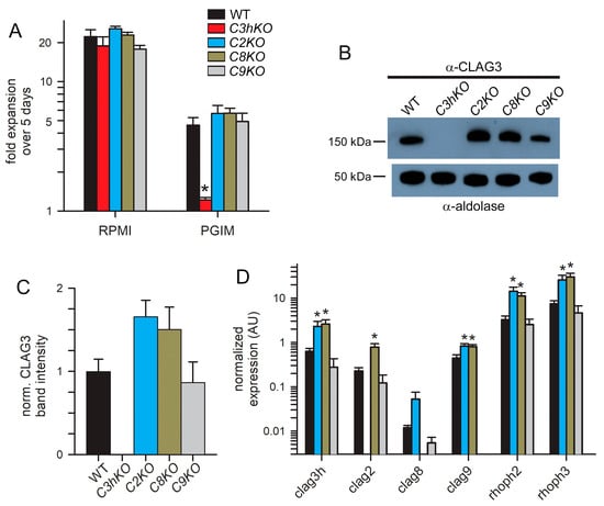 A striking property of the C3hKO CLAG3 knockout is that, although it grows at normal rates in the nutrient-rich RPMI 1640-based culture medium typically used for P. falciparum culture, it cannot be propagated in PGIM, a nearly identical medium with reduced and more physiological concentrations of the three key nutrients acquired via PSAC (Figure 3A, red bars; [15,29]). We, therefore, examined the growth kinetics of each new CLAG paralog knockout line (Figure 3A). As observed with other wild-type laboratory strains [15], KC5 expands at slower rates in PGIM than in the standard RPMI-based medium because of the reduction in key nutrients to more physiological levels. We confirmed that C3hKO expansion is uncompromised in an RPMI-based medium and that its growth is curtailed in PGIM (Figure 3A, red bars). In contrast to C3hKO, the C2KO, C8KO, and C9KO lines expanded at rates indistinguishable from the wild-type parent in both RPMI and PGIM, indicating that nutrient uptake is not significantly compromised in these other clag knockout lines.