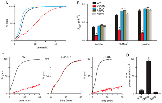 C3hKO exhibits reduced permeability to organic solutes, with 60–75% lower uptake rates for sorbitol, proline, and the organic cation phenyl-trimethylammonium (PhTMA+) [29] (Figure 4A,B, red bars). Because the uptake of these divergent solutes occurs almost exclusively via PSAC in infected cells, it is remarkable that C3hKO incurs only an incomplete reduction in these permeabilities. Notably, conditional knockdown of RhopH2 or RhopH3 quantitatively abolishes PSAC-mediated transport of organic and inorganic solutes [36]. We, therefore, measured solute permeabilities in the new paralog knockout lines using continuous tracking of osmotic lysis in sorbitol, PhTMA+, and proline solutions [29]. In contrast to C3hKO, the C2KO, C8KO, and C9KO lines did not exhibit reduced permeability to these solutes. Instead, C2KO and C8KO had modestly faster osmotic lysis in each solute (Figure 4A,B), which were statistically significant in experiments that measured PhTMA+ uptake (p < 0.02, one-way ANOVA, 3–4 independent trials for each knockout clone).