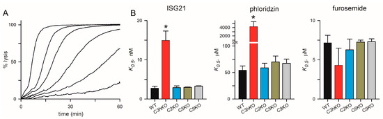 The C3hKO line also exhibits marked changes in inhibitor affinity with reduced efficacy of phloridzin, ISG21, and ISPA-1 block when compared to its KC5 wild-type parent [29]. These reduced affinities suggest that the binding sites for these inhibitors are partially defined by CLAG3. We hypothesized that these small molecule inhibitors interact with a specific pocket on the channel lined by one or more CLAG3 residues that are distinct from those on CLAG paralogs that take over channel formation upon clag3 knockout. We, therefore, examined inhibitor efficacy in each of the clag knockout lines and used the well-known PSAC inhibitors furosemide and phloridzin [41], as well as ISG21, a highly potent inhibitor identified through high-throughput screens [15]. This broad-spectrum inhibitor blocked KC5 channels with high affinity (K0.5 of 2.8 ± 0.5 nM) but was ~5-fold less effective against C3hKO (Figure 5A,B). Phloridzin, but not furosemide, also exhibited compromised affinity against Ch3KO channels (Figure 5B). In contrast to Ch3KO, channels on the C2KO, C8KO, and C9KO knockout lines did not incur changes in affinity with any of these inhibitors. These findings support the hypothesis that specific residues on CLAG3, which differ from the corresponding sites on the other CLAG paralogs, improve affinities for these particular inhibitors. Rather than reflecting a greater blocking capacity of CLAG3-associated channels, we suspect that higher expression of CLAG3, compared to other paralogs (Figure 3D), led to the identification of CLAG3-favoring blockers in low- and high-throughput searches. Presumably, inhibitor screens using the C3hKO line would find inhibitors that preferentially block channels associated with each other paralog.