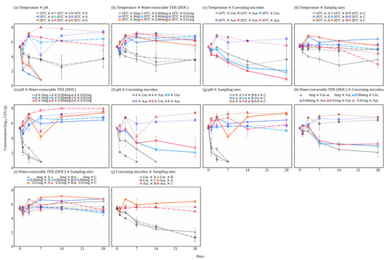 Figure 1 and Figure 2 show the changes in E. coli concentrations and the rate of population change of this bacterium during comparative experiments (focusing on two factors at a time). Under all conditions with the autoclaved sediments, E. coli survived for 28 days at all temperatures and grew at 20 and 30 °C (Figure 1a,b,d). The population change rates under the conditions with the autoclaved sediment of Lake A at 20 (−1.16 to 1.21 day−1) and 30 °C (−1.27 to 1.21 day−1) were higher than those at 10 °C (−1.14 to −0.12 day−1). The E. coli growth at above approximately 20 °C is consistent with a previous study reporting that E. coli can grow in autoclaved sediment [39,40]. Autoclaving sediments appear to provide nutrients that support the growth of E. coli and eliminate competitive and predatory coexisting microbes [40]. This provision of nutrients by the autoclave was consistent with the fact that the concentration of water-extractable DOC, which is an indicator of nutrients, was higher in the autoclaved sediments than in the untreated sediments (Table S1). Under all conditions with the autoclaved sediments, E. coli did not grow at 10 °C, which is consistent with a previous study that reported that it could not grow at a cooler temperature (4 °C) in autoclaved sediment [39]. These cells of E. coli, which could not grow, may have been in a viable but non-culturable (VBNC) state, as reported at a low temperatures (<10 °C) [41].