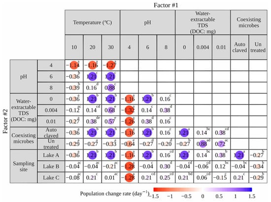 The population change rates in almost all conditions with the untreated sediment (−0.64–0.88 day−1) were significantly lower or comparable to those with the autoclaved sediment (−1.16–1.21 day−1). Previous studies reported that, in sediment environments, competition and predation inhibit the survival of E. coli [20,21]. Although this study could not distinguish whether the coexisting microbes in the sediments competed or preyed on E. coli, they inhibited their survival, which is consistent with the findings of previous studies [20,21].