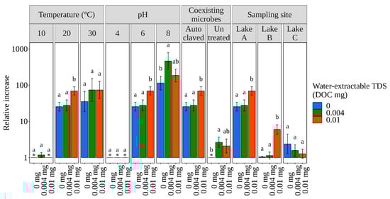 Relative maximum E. coli concentration during the comparative experiments focusing on the conditions of water-extractable TDS addition. In each treatment, different letters indicate significant differences (p < 0.05), whereas similar letters indicate no significant difference. An asterisk indicates that the relative increase was less than 1.