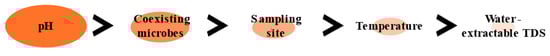 Based on the data in Table 2, the overall ranking of the independent effects of each factor on the rate of population change was determined, as shown in Figure 4. This overall ranking revealed that pH (η2 = 59.5–89.0%) significantly affected the population change rates (p < 0.005) the most, followed by coexisting microbes, sampling sites, temperature, and TDSs. This result was supported by MLR analysis using the population change rate and each factor as dependent and independent variables, respectively (Table S3). Previous studies reported that pH is the main factor affecting E. coli survival in river sediments [46] and soils [47,48]. Coexisting microbes (46.0–48.4%) had a more significant effect on population change rates than other factors, except for pH (9.0 and 59.5%, respectively) and water-extractable TDSs (1.7 and 0.4%, respectively). The sampling sites had a moderate effect on the population change rate among the five factors considered in this study. Although temperature and organic matter content have also been recognized to affect E. coli survival [14,17], surprisingly, this study showed that temperature (16.2–25.8%) and TDSs (0.4–20.9%) had a smaller effect on population change rates than the other factors. Most previous studies have developed numerical models to simulate E. coli survival in sediments in aquatic environments, ignoring the effects of sediment factors [24,25]. For more reliable simulations, it is recommended that numerical models be developed with preferential consideration to pH and coexisting microbes, which have a higher rank in the independent effects of the sediment factors determined in this study.