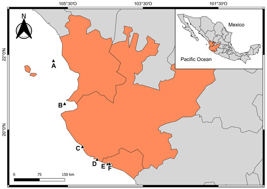 The study area covered insular and coastal sites within the MCP—Nayarit, Jalisco, and Colima (Figure 1)—with an approximate distance of 350 km. The sampling sites were as follows: (A) Isla Isabel National Park (21°50′39.62″ N, 105°52′46.96″ W), the northernmost site; (B) Islas Marietas National Park (20°41′54.1″ N, 105°34′58.1″ W), (C) Islas e islotes de Bahía Chamela Sanctuary (19°33′19.7″ N 105°06’28.8″ W), (D) Bahía Cuastecomates-Punta Melaque (19°13′51.7″ N 104°44′01.9″ W), and (E) Carrizales (19°05′44.9″ N 104°26′08.7″ W) in Bahía Ceníceros and (F) Punto B (19°5′55.21″ N, 104°23′24.47″ W) in Bahía Santiago, both on the coast of the southern boundary of the MCP.