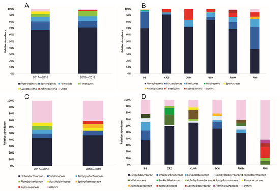 At the temporal level, the phylum Proteobacteria contributed the highest relative abundance (67.0–71.1%), followed by Bacteroidetes and Firmicutes (Figure 2A). In total, 109 families were shared between years, with 113 families recorded in the first year and 189 families in the second year of sampling. The dominant families were Helicobacteraceae (42.9–46.9%) and Vibrionaceae (6.4–7.1%) (Figure 2B). Other predominant families were Burkholderiaceae (4.1–5.3%), Campylobacteraceae (2.2–6.2%), Flavobacteriaceae (2.6–5.8%), and Acholeplasmataceae (2.1–3.9%).